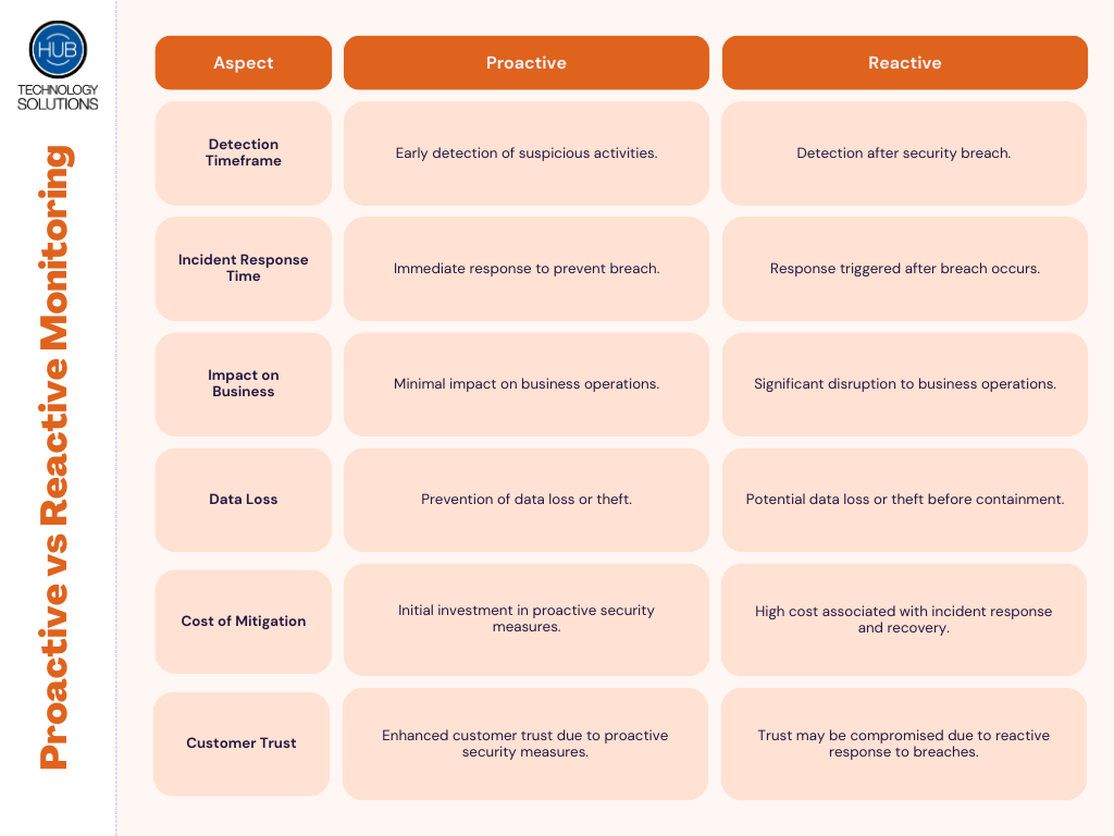 It becomes evident that proactive monitoring is crucial for preventing potential security breaches before they escalate, while reactive monitoring primarily responds after incidents occur.